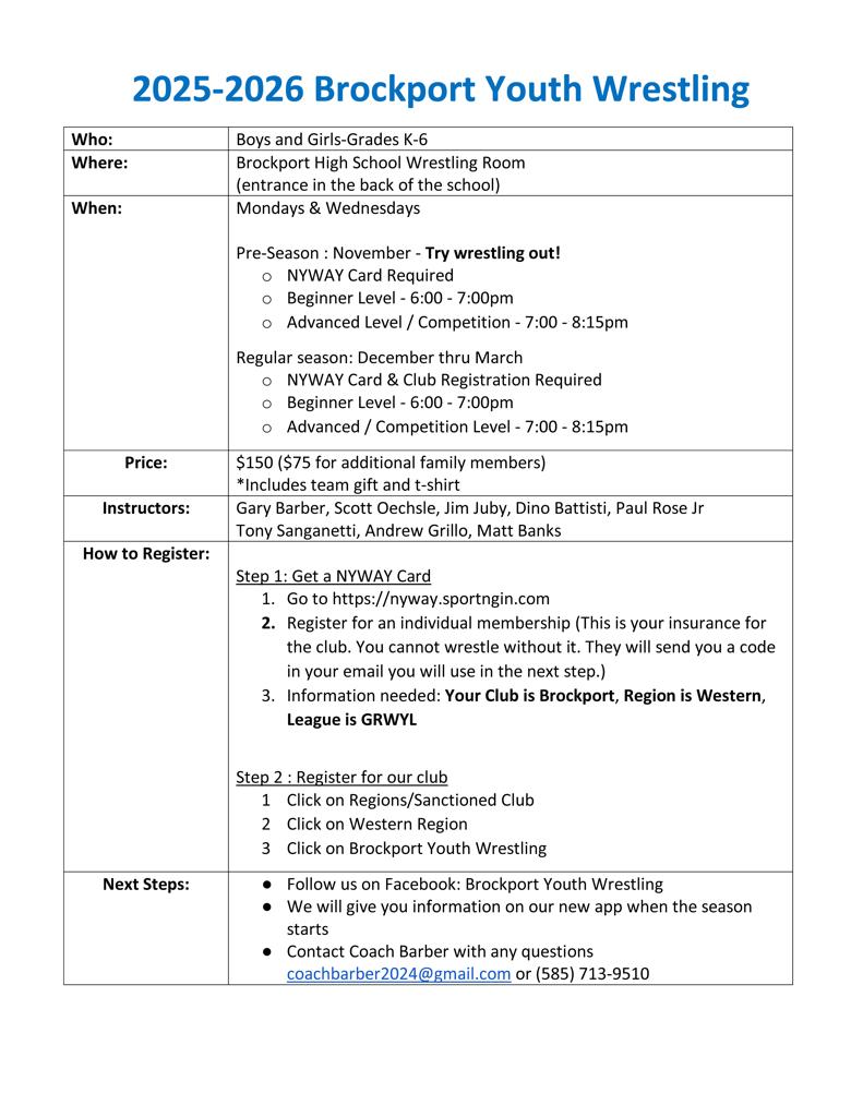 Click on Brockport Youth Wrestling Club Logo to be directed to their Club sign-ups!