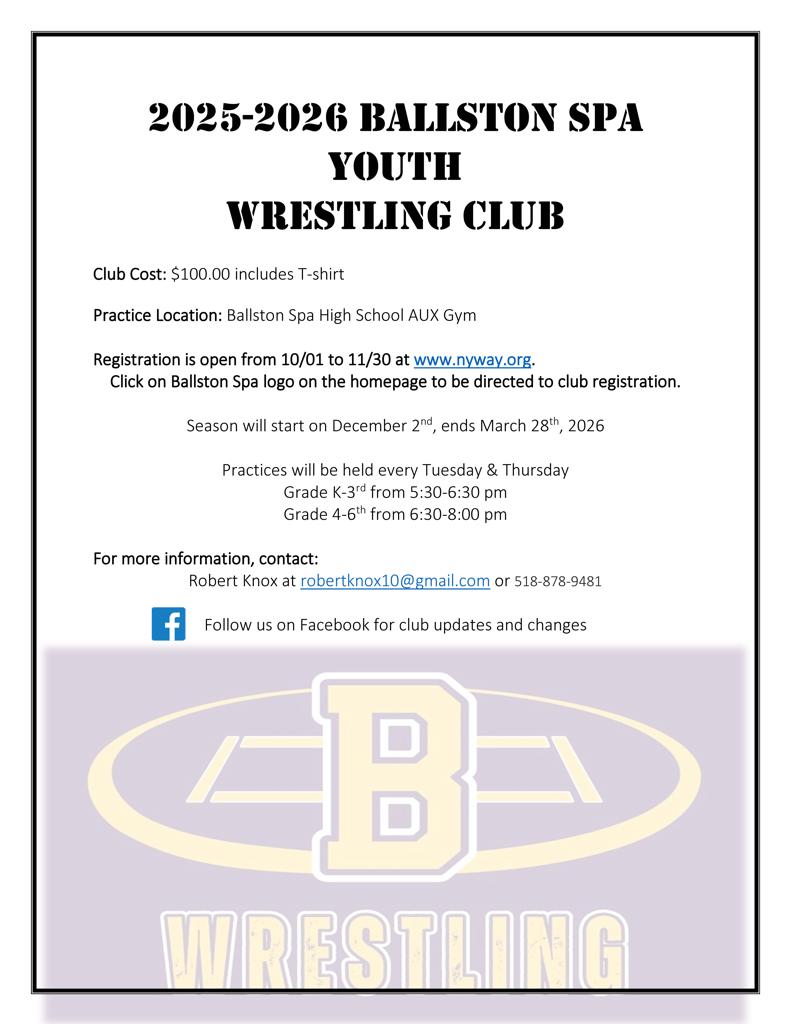 Click on Ballston Spa Youth Wrestling Club Logo to be directed to their Club sign-ups!