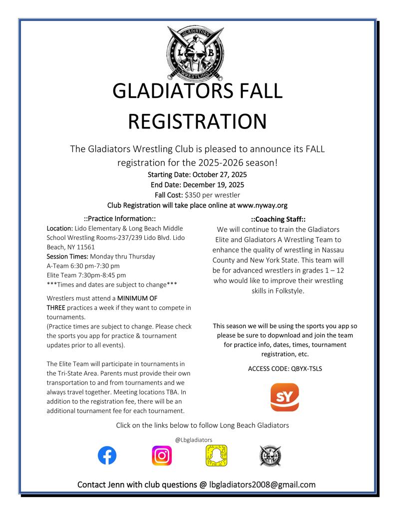 Click on Long Beach Gladiators Wrestling Club Logo to be directed to their Club sign-ups!